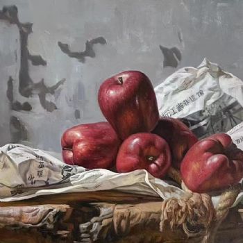• 纯手绘超写实油画静物油画红苹果与报纸精品油画