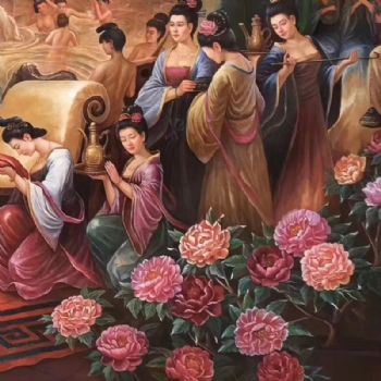 • 纯手绘大型人物油画贵妃沐浴图精品牡丹人物逼真形象适合酒店大厅挂画
