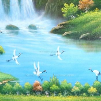 • 风水油画 聚宝盆 青松 白鹤 瀑布 小鹿 木屋 纯手绘手工 线条框