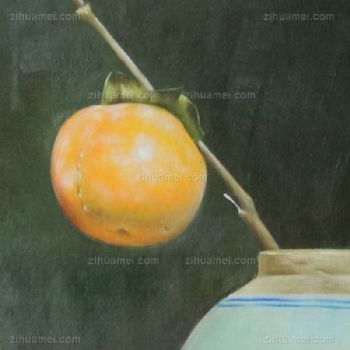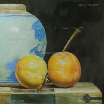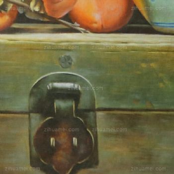 • 纯手绘手工 原创油画 青花瓷 杮子与木箱 线条框