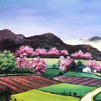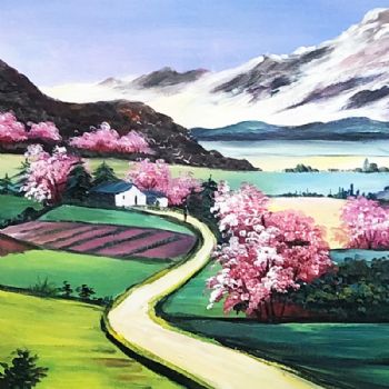 • 纯手绘美式风景油画桃花开时的田园风光景物油画写意风景画