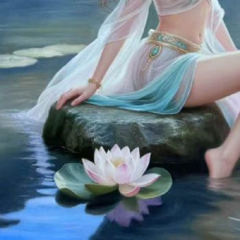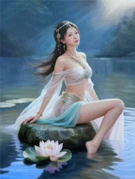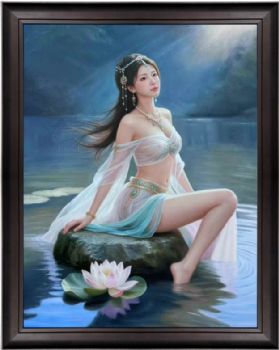 • 布面油画美女创意纯手绘手工油画溪边莲花女