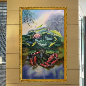 • 纯手绘手工 九鱼图 荷花 和谐 美满 中式油画 家庭挂画 酒店挂画