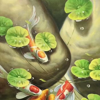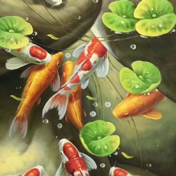 • 纯手绘手工 九鱼图 荷花 和谐 美满 团团圆圆 中式油画 家庭挂画 酒店挂画C