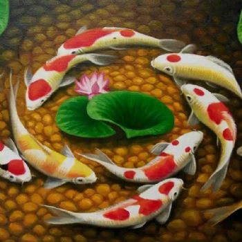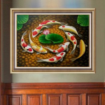 • 纯手绘手工 九鱼图 荷花 和谐 美满 团团圆圆 中式油画 家庭挂画 酒店挂画D