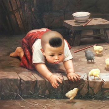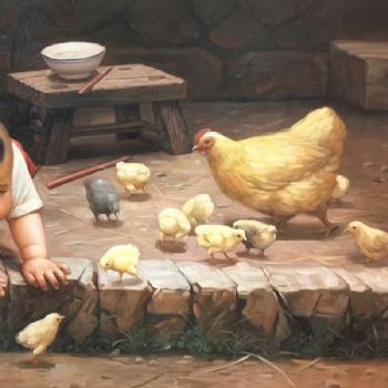 首页 --> 艺术商城 --> 油画人物 --> 中式人物 --> 字画美官方旗舰店 --> 纯手工手绘油画中式油画客厅壁炉玄关装饰挂画儿童与小鸡