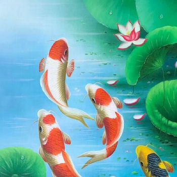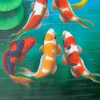 • 纯手绘手工 九鱼图 荷花 和谐 美满 团团圆圆 中式油画 家庭挂画 客厅挂画