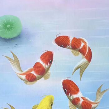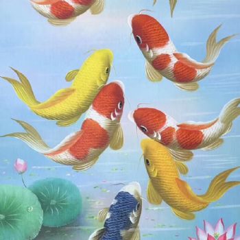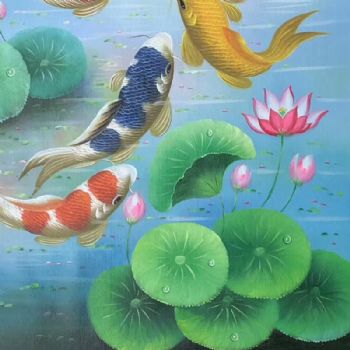 • 纯手绘手工 九鱼图 荷花 和谐 美满 团团圆圆 中式油画 家庭挂画 客厅挂画