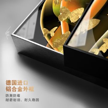 晶瓷与金属的结合,诠释家居装饰新风尚。晶瓷画,顾名思义不但有像水晶一样的通透,更有像玉瓷一样的无暇。画与画固为一体,中间没有空气与杂质、晶莹剔透、碧洁无暇。