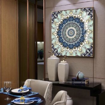 晶瓷与金属的结合,诠释家居装饰新风尚。晶瓷画,顾名思义不但有像水晶一样的通透,更有像玉瓷一样的无暇。画与画固为一体,中间没有空气与杂质、晶莹剔透、碧洁无暇。