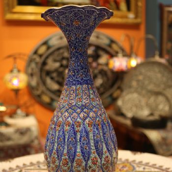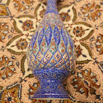 米娜mina是在金属表面上釉、着色、绘画的复杂艺术,采取细密画和珐琅工艺。在波斯语中的意思是女神的面纱,代表了天空的颜色,因此大部分的米娜是以天蓝色为底色,展现出了优美的体态和绚丽的色彩。在字画美中,可以看到各种独具波斯特色的杯盘和花瓶器皿,米娜盘大中小都有,精美细致,快快选购。
