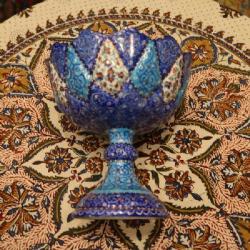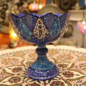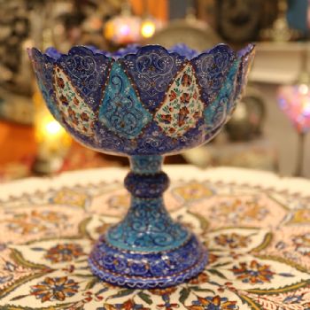 米娜mina是在金属表面上釉、着色、绘画的复杂艺术,采取细密画和珐琅工艺。在波斯语中的意思是女神的面纱,代表了天空的颜色,因此大部分的米娜是以天蓝色为底色,展现出了优美的体态和绚丽的色彩。在字画美中,可以看到各种独具波斯特色的杯盘和花瓶器皿,米娜盘大中小都有,精美细致,快快选购。