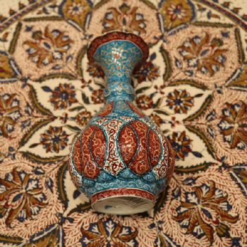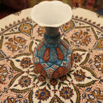 伊朗的手工艺品中最出名的莫过于米娜(mina),Khatam和波斯地毯。而米娜乍看像瓷器, 其实是铜制的。它是在压制好的铜盘上,以锤子手工敲打出凹凸有致的形状,然后经过五六次手工绘制,2次高温烧制将颜色固定才算完成,每套都很好看呢,装饰效果很强。