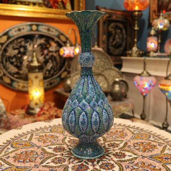 米娜mina是在金属表面上釉、着色、绘画的复杂艺术,采取细密画和珐琅工艺。在波斯语中的意思是女神的面纱,代表了天空的颜色,因此大部分的米娜是以天蓝色为底色,展现出了优美的体态和绚丽的色彩。在字画美中,可以看到各种独具波斯特色的杯盘和花瓶器皿,米娜盘大中小都有,精美细致,快快选购。