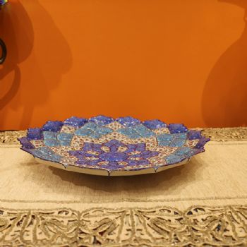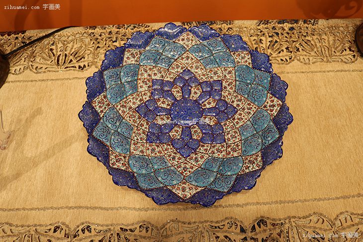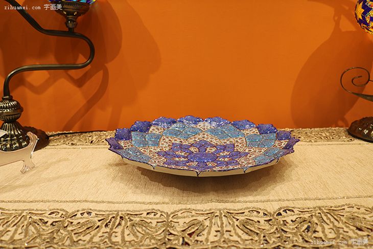 米娜mina是在金属表面上釉、着色、绘画的复杂艺术,采取细密画和珐琅工艺。在波斯语中的意思是女神的面纱,代表了天空的颜色,因此大部分的米娜是以天蓝色为底色,展现出了优美的体态和绚丽的色彩。在字画美中,可以看到各种独具波斯特色的杯盘和花瓶器皿,米娜盘大中小都有,精美细致,快快选购。