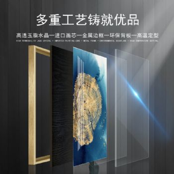 晶瓷与金属的结合,诠释家居装饰新风尚。晶瓷画,顾名思义不但有像水晶一样的通透,更有像玉瓷一样的无暇。画与画固为一体,中间没有空气与杂质、晶莹剔透、碧洁无暇。