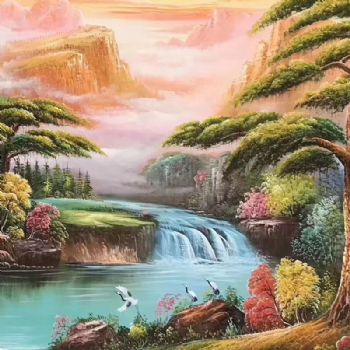 • 中式油画 风水油画 青松 木屋喻人丁兴旺 聚宝盆财富 白鹤象征长寿 一幅有深刻意义的优秀作品