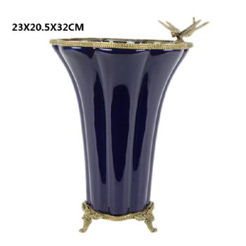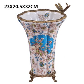 • 装饰花插古典风格陶瓷配铜彩绘花草图案纯铜镂空装饰花瓶花插摆件