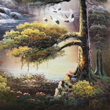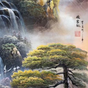 首页 --> 艺术商城 --> 动物油画 --> 仙鹤 --> 字画美官方旗舰店 --> 实力画家竖幅手绘迎客松油画新中式油画适合玄关挂画实木画框