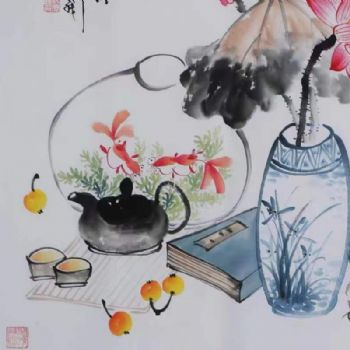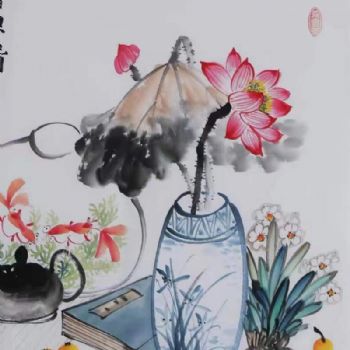 • 兰花读书手绘国画荷花静心赏鱼游得自在清供图孔庆义风格国画四尺斗方