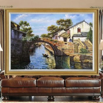 • 手绘油画江南水乡写意风景油画小桥流水人家实木画框客厅走廊挂画