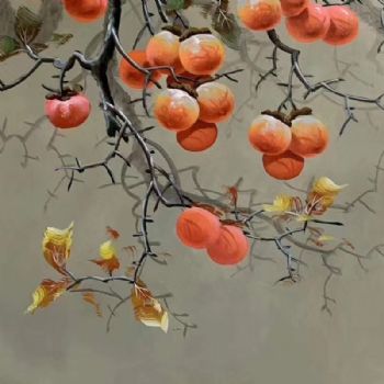 新中式手绘油画柿子与喜鹊