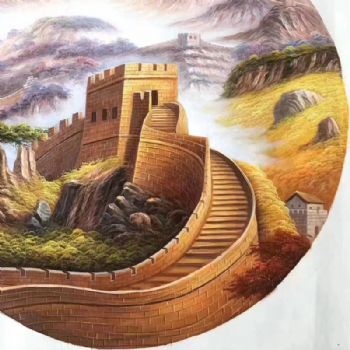 • 炎黄子孙万里长城青山绿水现代新中式油画油画风景写实油画圆形风格实木画框
