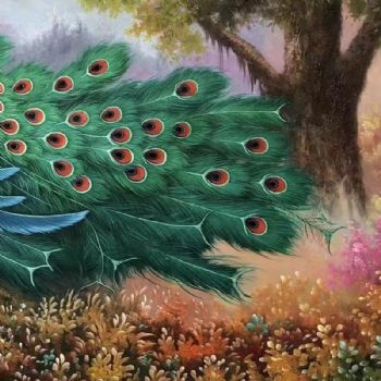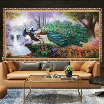 • 新中式纯手绘油画吉祥孔雀别墅客厅酒店厅玄关过道楼梯定制装饰油画