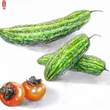 • 从来好事天生俭 自古瓜儿苦后甜写实国画花鸟画苦瓜与柿子图