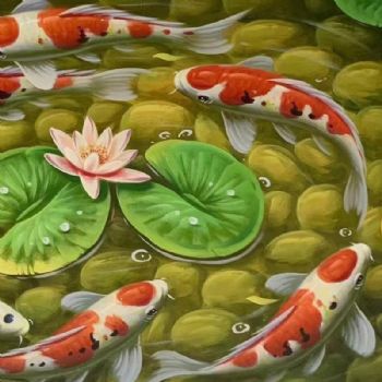 • 吉祥喜庆风水油画新中式纯手绘九鱼图时来运转适合办公室油画