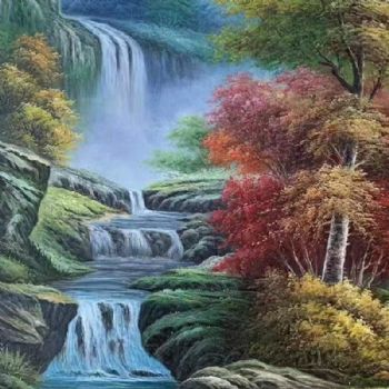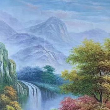 • 竖幅山水风景油画纯手绘写实山水画实木画框适合酒店玄关的风景油画