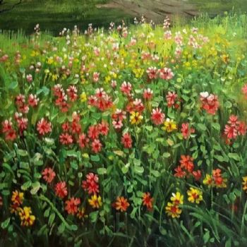 • 红色小花朵花海系列故乡的小河春暖花开纯手绘风景油画