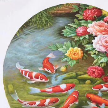 • 九鱼图新中式纯手绘锦鲤图写实动物油画年年有鱼花开富贵牡丹图