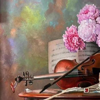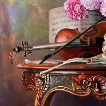 • 欧式古典精品花卉系列纯手绘写实油画桌面上的小提琴花卉油画