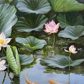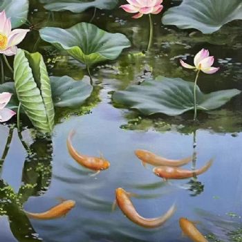 • 写实风景油画纯手绘风景画荷花池锦鲤风景油画大厅挂画