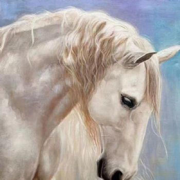 首页 --> 艺术商城 --> 动物油画 --> 八骏图马头 --> 字画美官方旗舰店 --> 淡蓝背景白马系列纯手绘当代艺术马头小写意现代油画作品