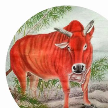 • 纯手绘国画工笔四尺斗方花鸟扇面公牛图勤奋努力书房挂画柚木画框
