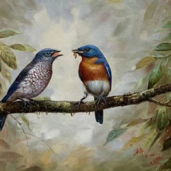 • 精品纯手绘动物写意油画荔枝树上的两只恩爱小鸟厚肌理油画