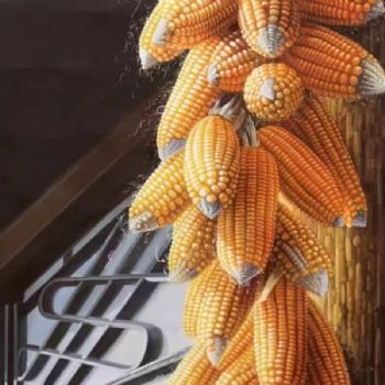 • 新中式静物写实油画挂在房檐下的玉米图寓意年年丰收实木画框