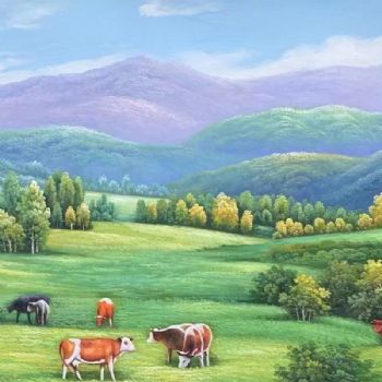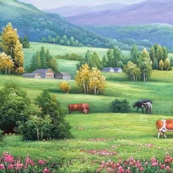 • 林间的小屋优美风景油画山水画纯手绘美式山间风景牛奶牧草图实木画框