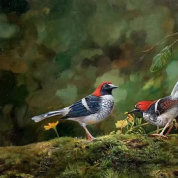 • 丛林中的两只美丽小鸟纯手绘油画动物写实油画实木画框