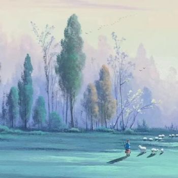 • 现代轻奢简约风景油画林中牧羊人纯手绘田园风景油画PS环保线条框