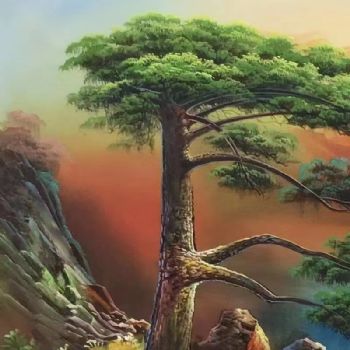 • 纯手绘迎客松仙鹤鹿聚宝盆风景油画