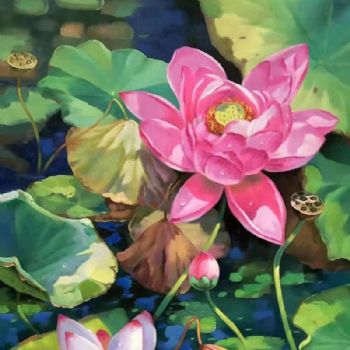 • 纯手绘花卉油画荷花图和气生财家大业大新中式油画
