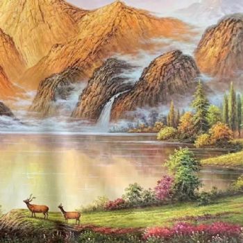 • 纯手绘金山油画鹿鹿通客厅山水风景油画聚宝盆油画