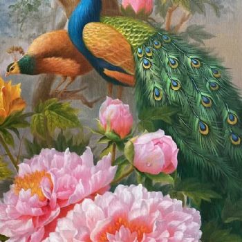 • 花开富贵纯手绘牡丹孔雀油画