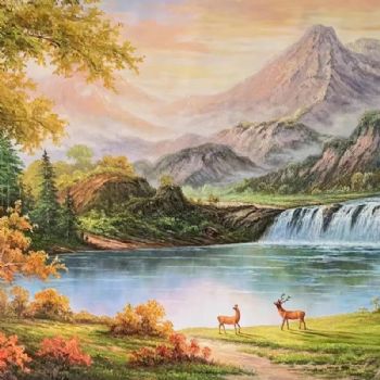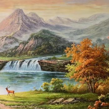 • 路路通背靠大山山水风景油画纯手绘厚理欧式风景油画