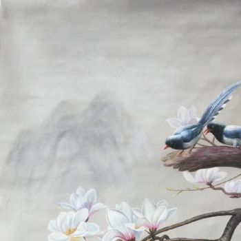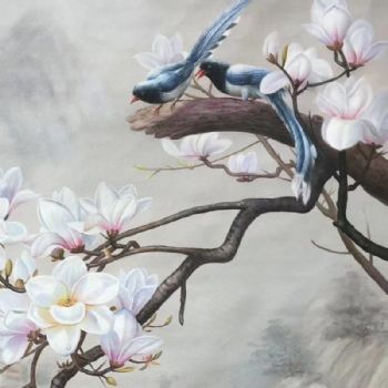 • 实木画框花卉油画玉兰花喜鹊油画