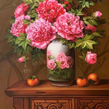 • 纯手绘精品写实花卉油画花开富贵瓶瓶安安牡丹油画实木画框