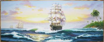 • 纯手绘海浪帆船风景油画一帆风顺客厅大厅挂画铝合金边框金色